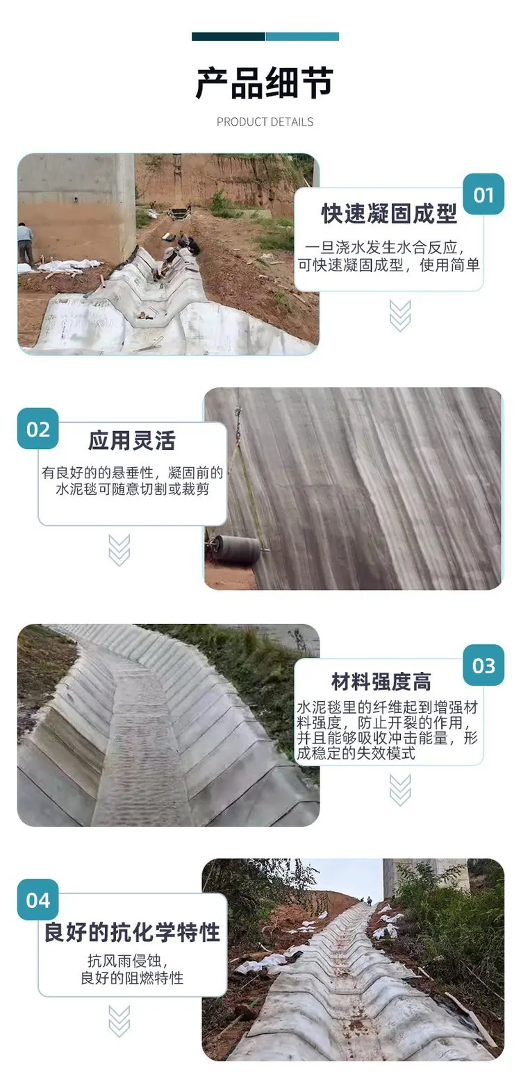 1. 多功能性:水泥毯可以用于护坡、硬化、防水等多个工程领域,具有广泛的适用性。