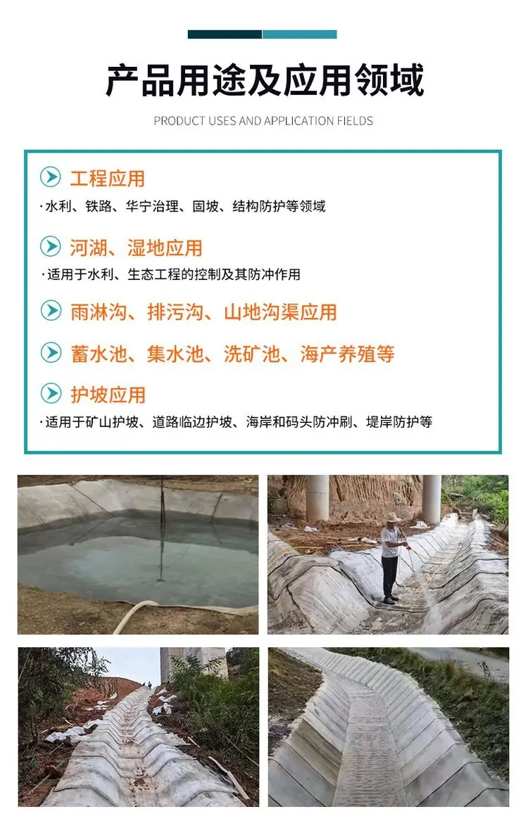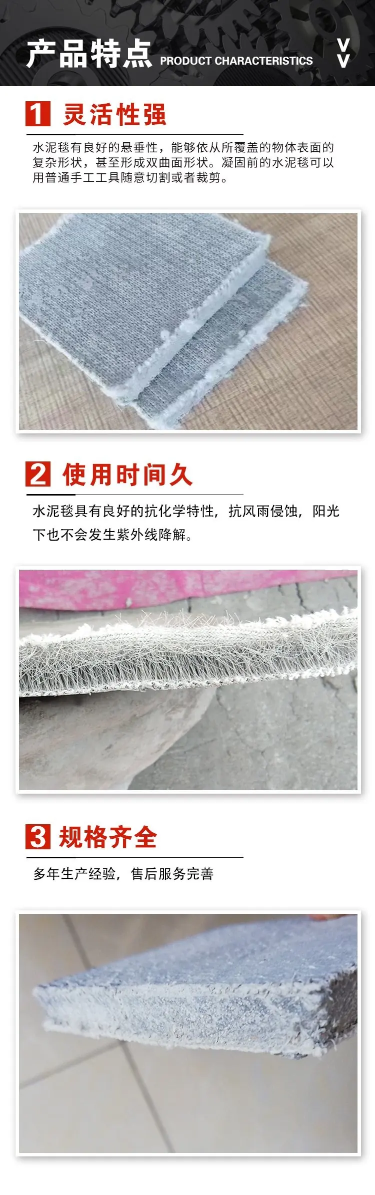 3. 灵活可裁剪:水泥毯可以根据实际需要随意裁剪,适应各种形状和尺寸的工程要求。